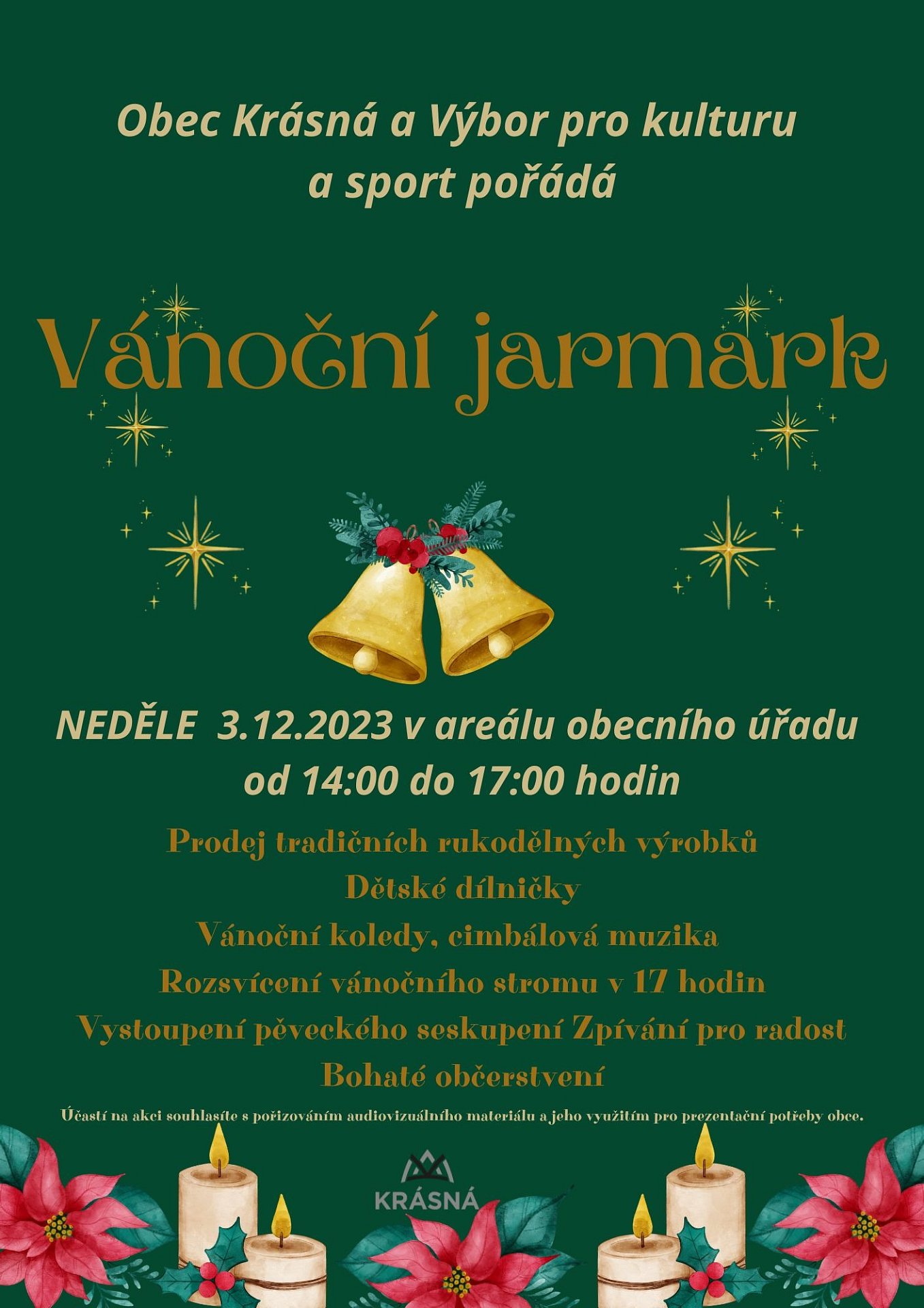 již zítra se od 14 do 17 hodin v areálu Obecního úřadu Krásná koná Vánoční jarmark. Čeká Vás bohatý program a občerstvení. Přijďte si užít předvánoční atmosféru!