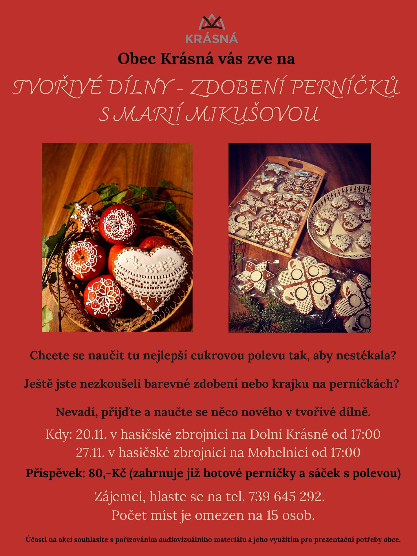 Obec Krásná Vás zve na tvořivé dílny – zdobení perníčků s Marií Mikušovou. Přijďte si vyzkoušet něco nového 20.11.2023 do hasičské zbrojnice na Dolní Krásné a 27.11.2023 do hasičské zbrojnice na Mohelnici. Zájemci ať se hlásí na tel. 739 645 292. Počet míst je omezen!