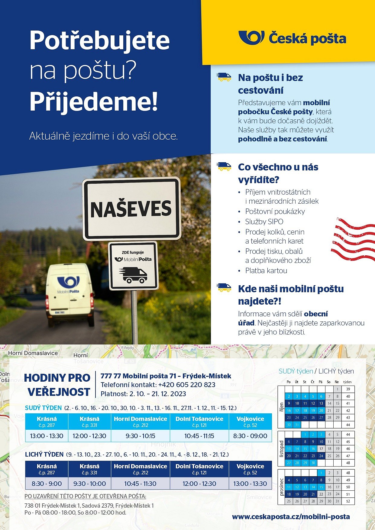 dovolujeme si Vám představit mobilní pobočku České pošty, která bude do naší vesnice od 2.10.2023 každý den zajíždět. Stát bude vždy u obecní úřadu a u hasičské zbrojnice na Dolní Krásné. Kompletní rozpis hodin pro veřejnost a popis nabízených služeb naleznete v letáčku níže.