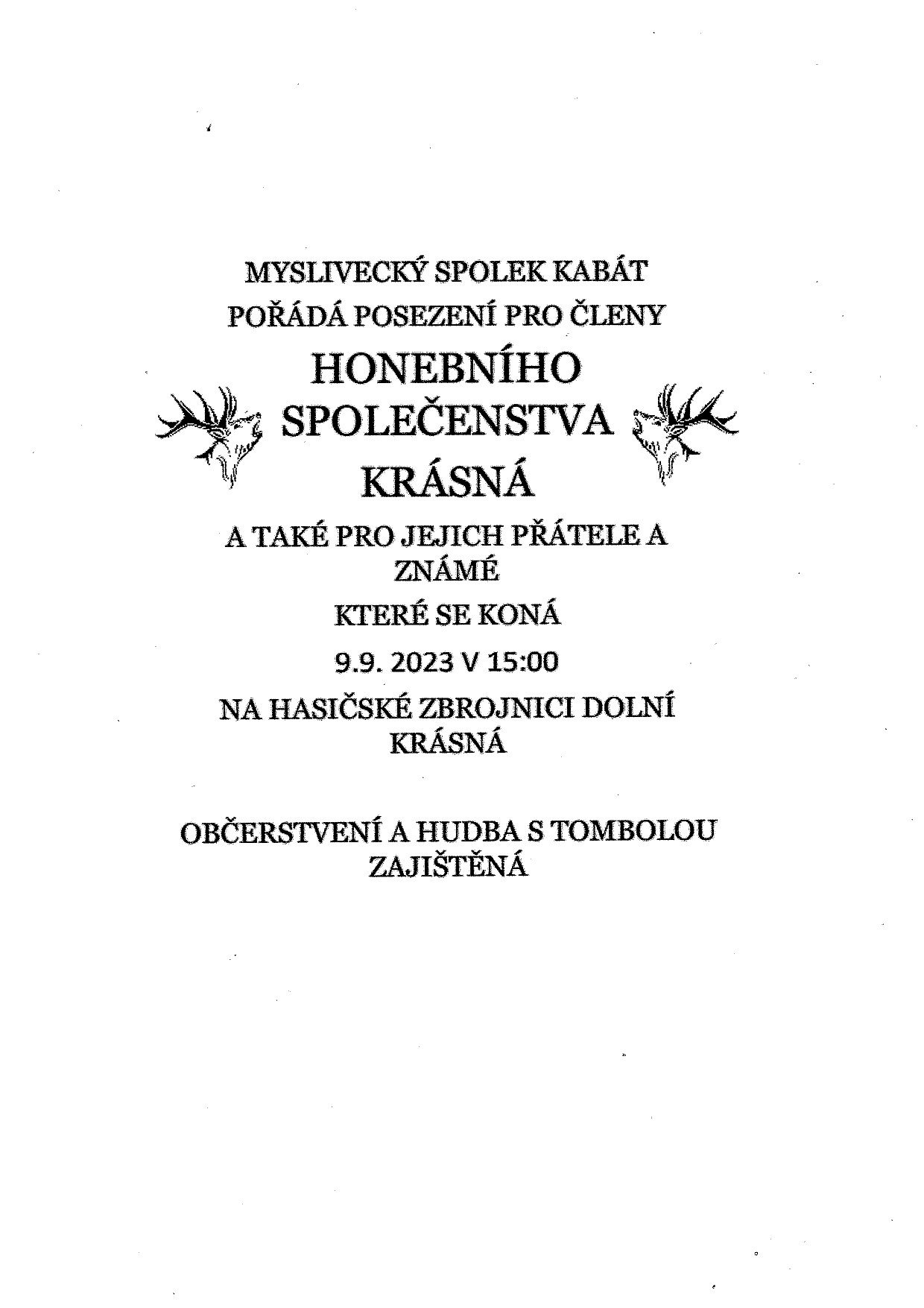 Myslivecký spolek Kabát pořádá v sobotu 9. září 2023 od 15 hodin v hasičské zbrojnici na Dolní Krásné posezení s hudbou a tombolou.