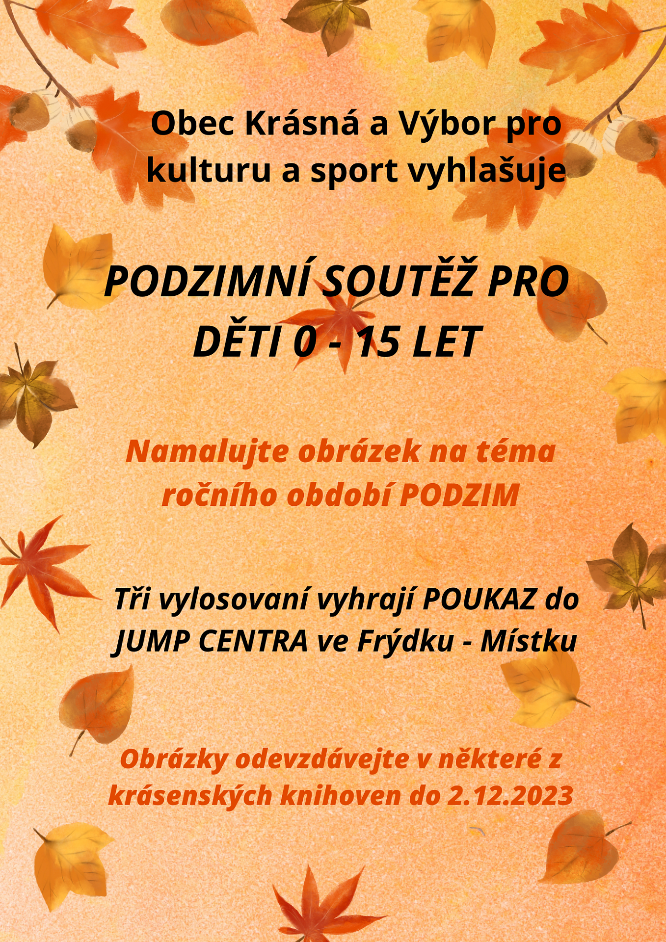 obec Krásná a Výbor pro kulturu a sport vyhlašuje podzimní soutěž pro děti ve věku 0-15 let. Namalujte obrázek na téma „podzim“ a odevzdejte jej v některé z krásenských knihoven do 2.12.2023. Tři vylosovaní vyhrají poukaz do Jump Centra ve Frýdku – Místku.