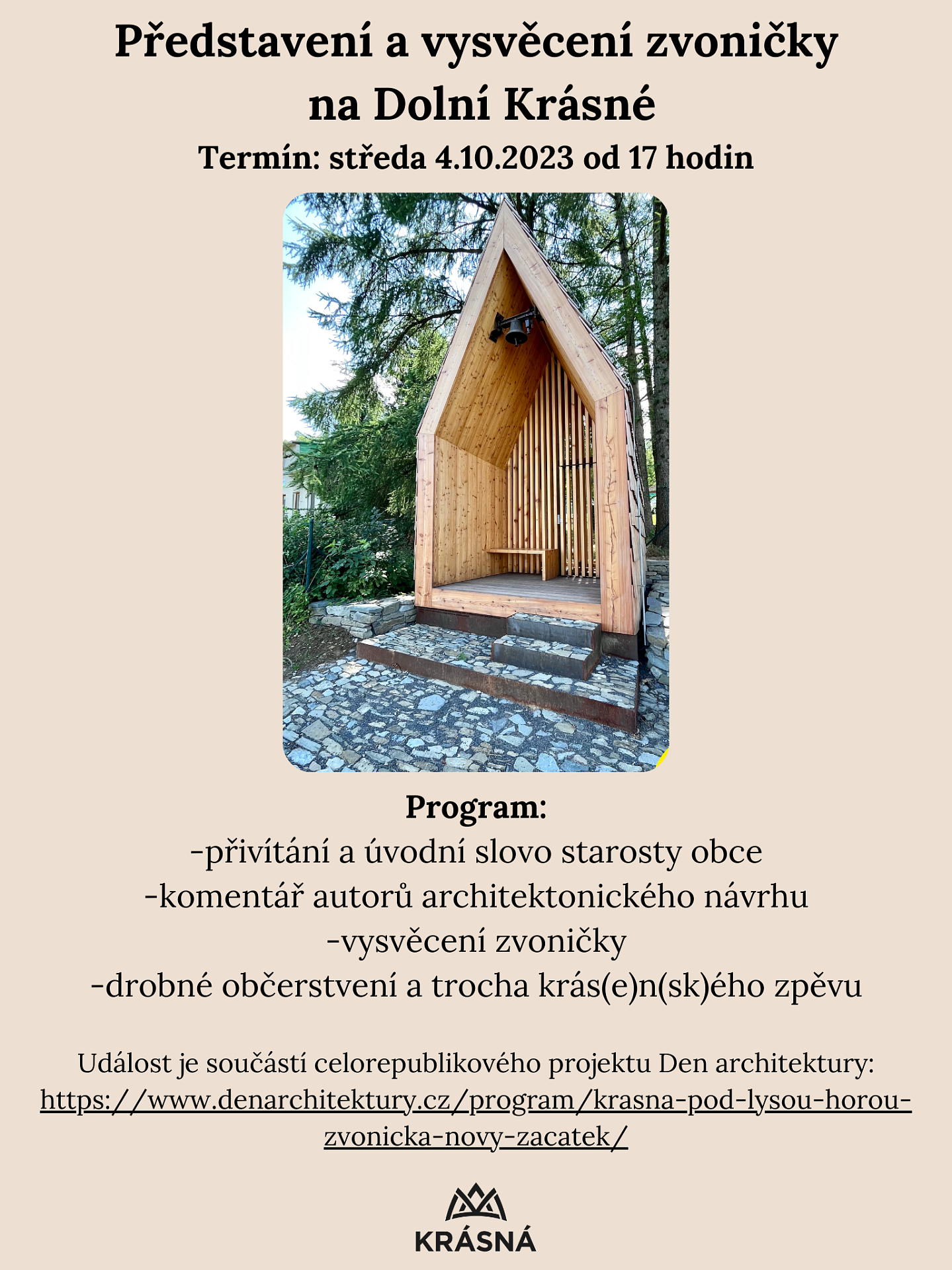 srdečně Vás zveme na představení a vysvěcení zvoničky na Dolní Krásné, které se koná ve středu 4.10.2023 od 17 hodin.