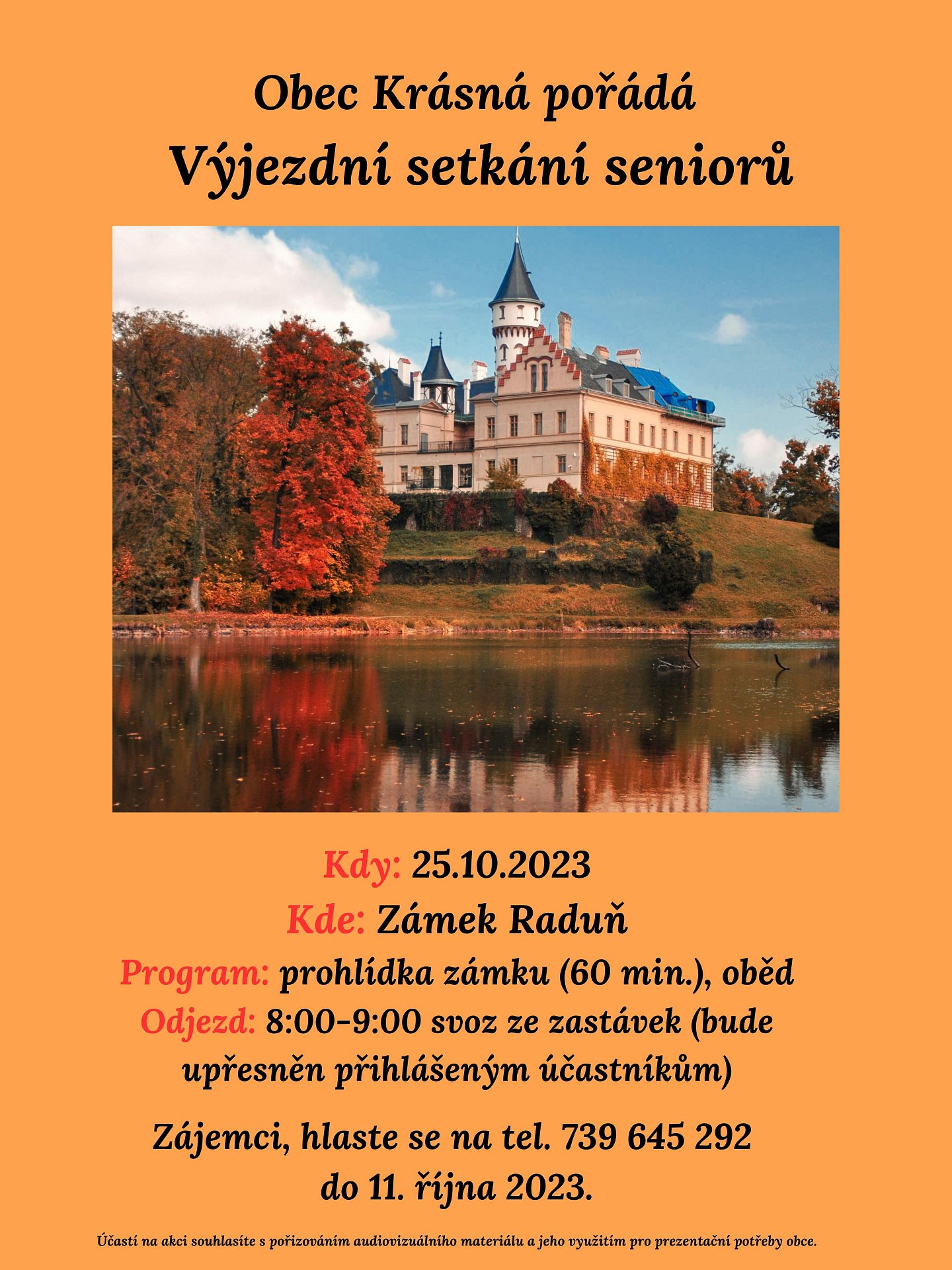 dovolujeme si Vás pozvat na výjezdní setkání seniorů na zámek Raduň 25.10.2023. Na programu je prohlídka zámku a oběd v nedaleké restauraci Raduňka s výhledem na zámecké jezírko.