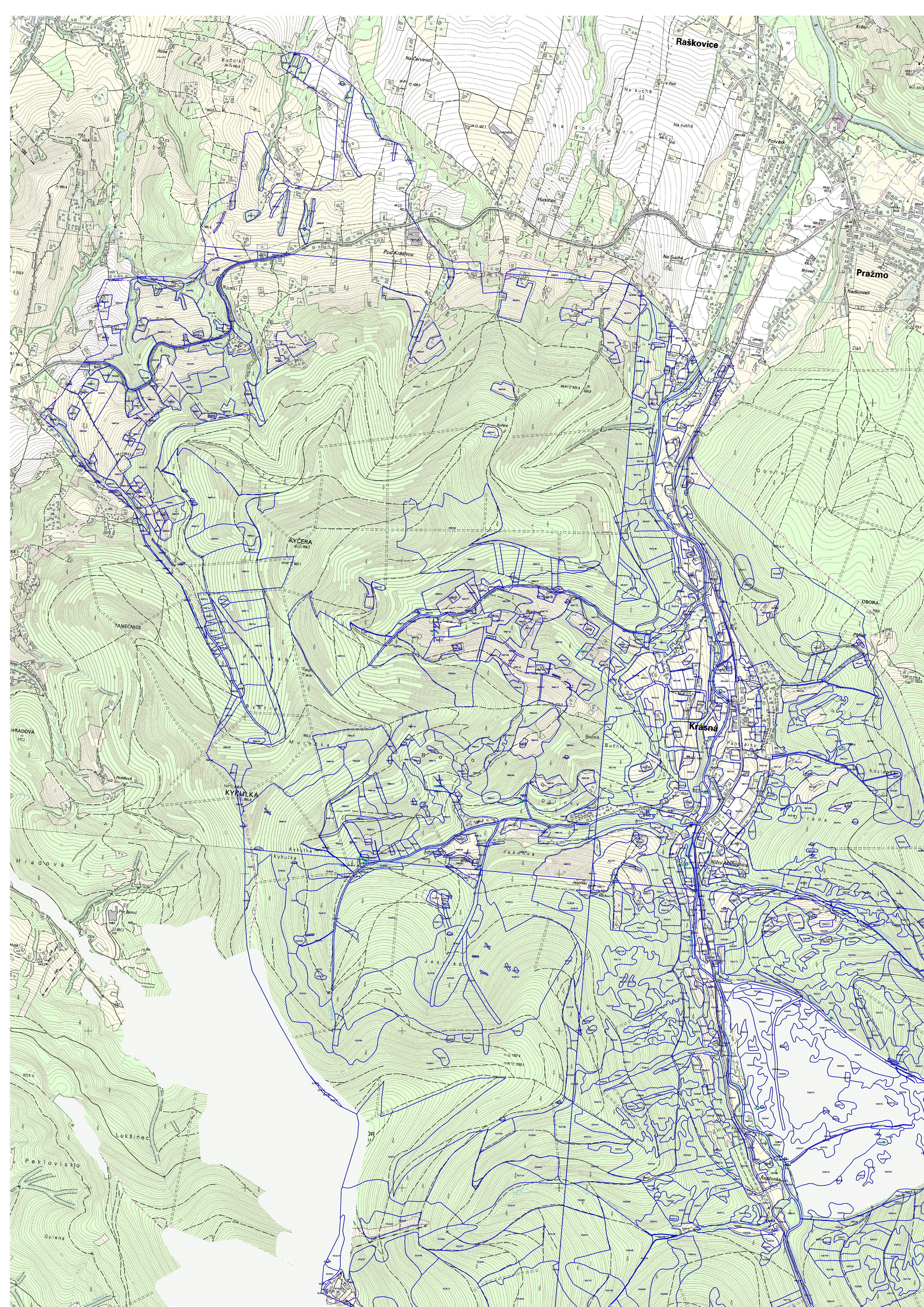 - základní funkce pro práci s mapou: přiblížení, oddálení, posun mapy, měření vzdáleností, zobrazení souřadnic, proklik na informace o parcele na stránkách ČÚZK, tisk a export mapy